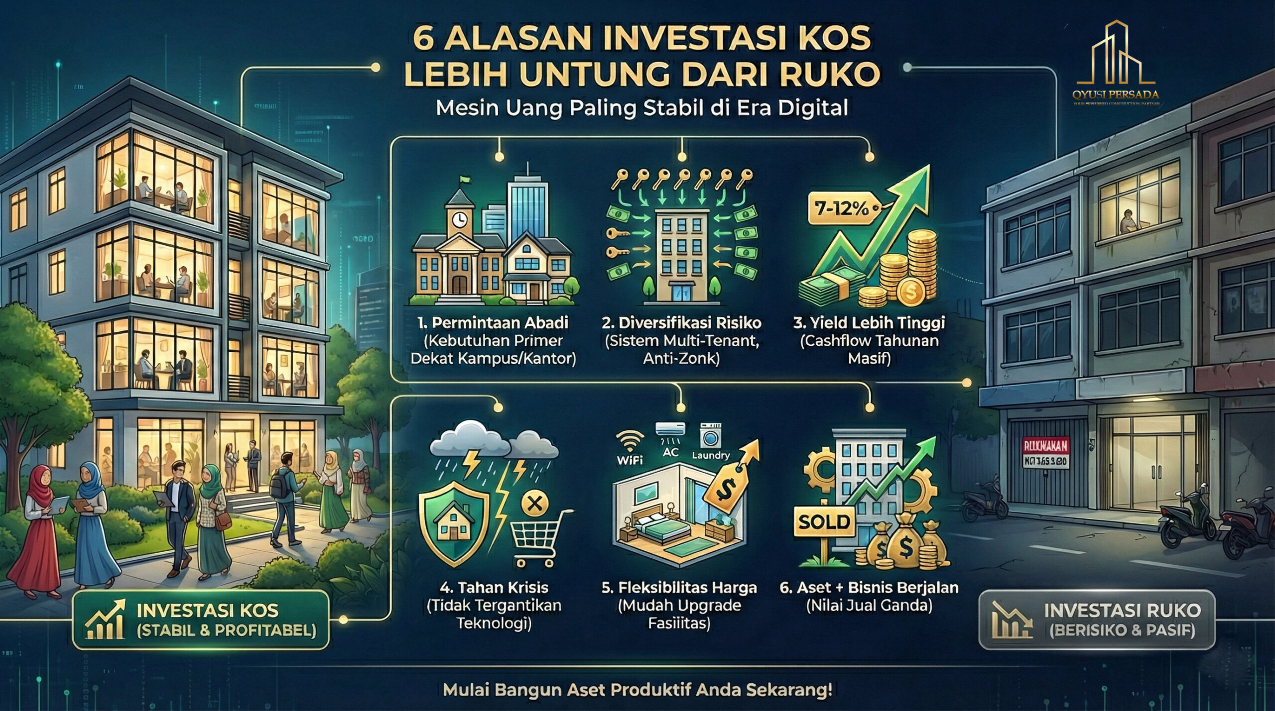 Namun, tidak ada teknologi yang bisa menggantikan kebutuhan manusia akan tempat tidur dan kamar mandi. Meskipun ekonomi sedang lesu, mahasiswa tetap butuh tempat tinggal dekat kampus, dan pekerja perantau tetap butuh hunian dekat kantor. Investasi kos terbukti lebih adaptif terhadap perubahan gaya hidup digital.