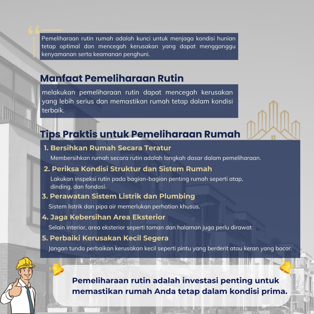 Pemeliharaan rutin adalah investasi penting untuk memastikan rumah Anda tetap dalam kondisi prima. Dengan mengikuti tips di atas, Anda dapat mencegah kerusakan besar dan menjaga nilai properti tetap tinggi.